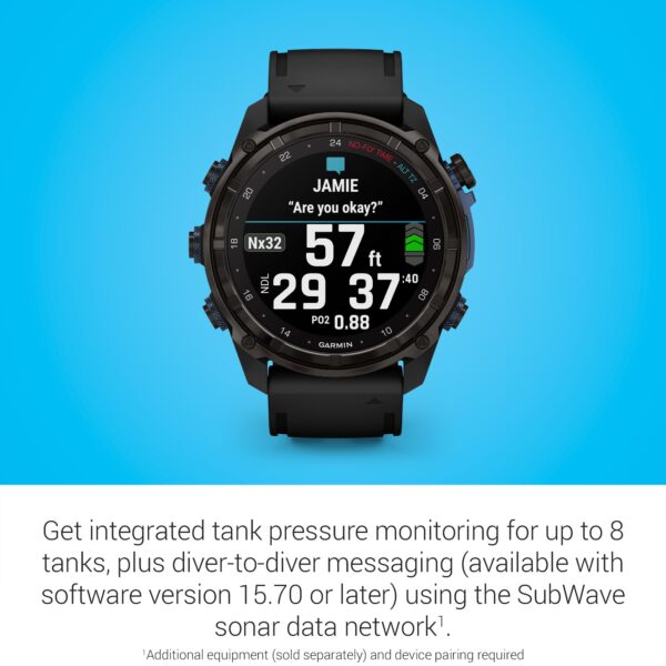 - Enhanced SubWave sonar technology provides the ability to exchange preset diver-to-diver messages up to 30 meters (available with software v.15.70 or later) as well as monitor tank pressures and depth for up to eight divers, within a range of 10 meters when paired with the Descent T2 transceiver (sold separately) for group dive support