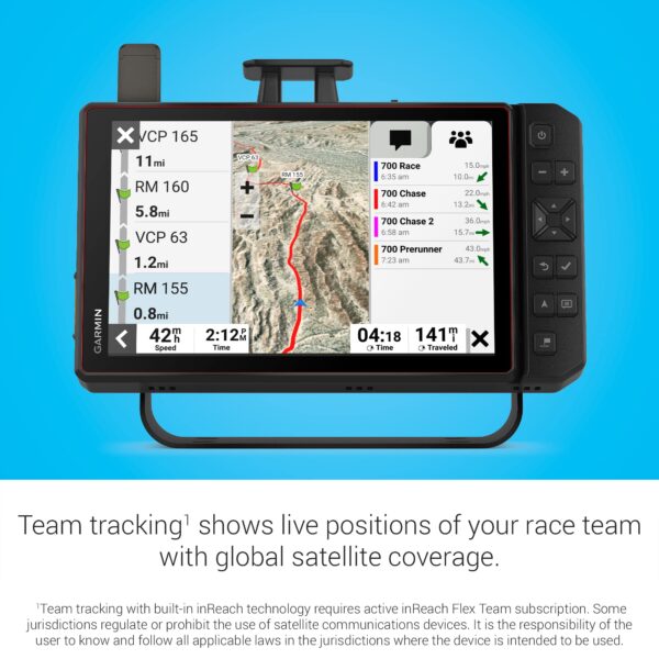 - Team tracking with built-in inReach technology (Requires active inReach Flex Team subscription. Some jurisdictions regulate or prohibit the use of satellite communications devices.) allows race vehicles and chase trucks to message and track each other with live position updates from anywhere