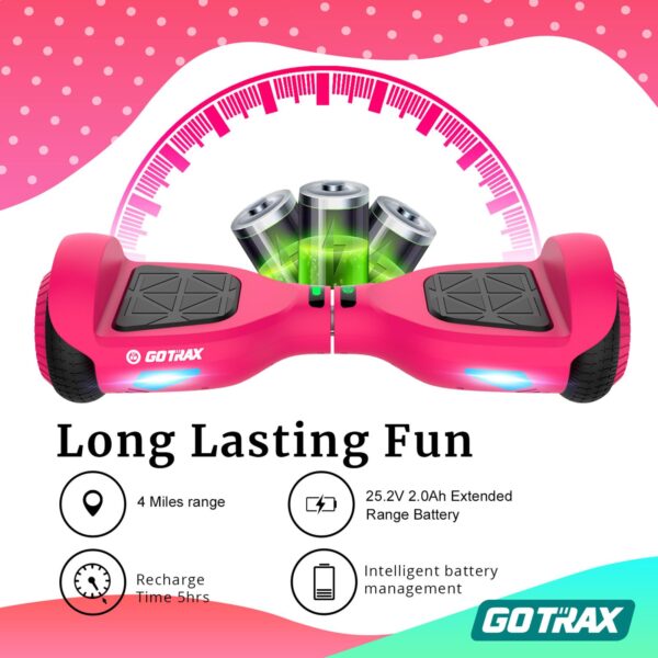- POWERFUL JOYRIDE – Gotrax EDGE hoverboard with dual brushless motors, you can take your riding to a fun and safe top speed of 6.2mph. Equipped with 50.4Wh low self-discharge rate battery pack offers up to 4 miles of continuous riding on a single charge (travel distance depends on rider’s weight, terrain and so on).