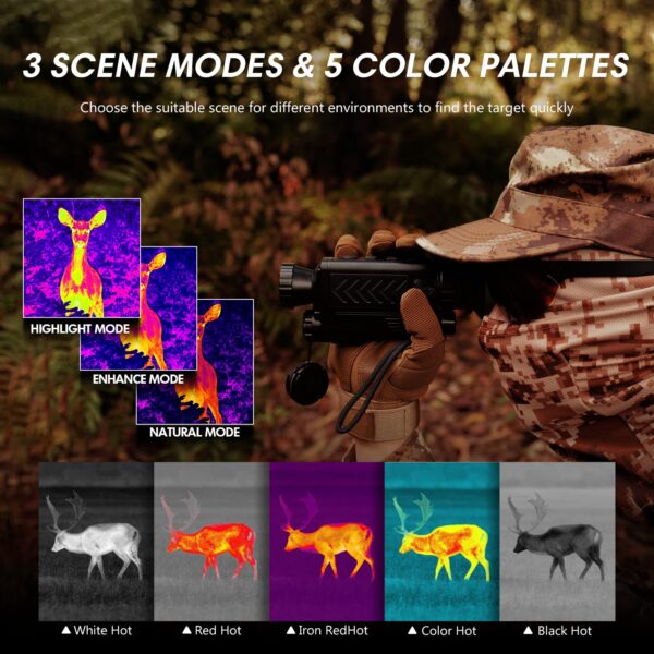 • 【Multiple Modes】 – The color palette of this digital monocular offers 4 display modes – white hot, black hot, rainbow, iron red – to help hunters identify objects more quickly & accurately. The PIP mode can zoom in on the target when you are in the complex outdoor scenes, and highlight the details of the target. The GTGUARD hunting monocular offers 1x, 2x and 4x digital zoom, Magnification 2.6x – 10.4x allowing you to get a closer look at your targets.