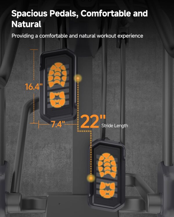 - 【Professional-Grade Stability & Comfort】Built with a heavy-duty steel frame, our elliptical exercise machine supports up to 650 lbs and offers a 22″ stride length, accommodating users up to 7’5″. The 16.4″ x 7.4″ extra-wide, non-slip pedals ensure a comfortable and secure workout, while the natural motion path mimics real walking or running, making it ideal for all fitness levels.