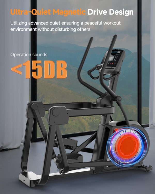 - 【Whisper-Quiet Magnetic Drive System】Experience a smooth and silent workout with our advanced magnetic drive system. Operating at just 15dB, this home elliptical ensures a peaceful exercise session without disturbing others. The front-drive design, combined with a 33LBS flywheel, provides excellent balance and a natural motion for both forward and reverse strides.