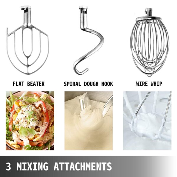 - REPLACEABLE ATTACHMENTS- Three replaceable attachments are available. Spiral Dough Hook: Used for smoother mixer operation. Ideal for pizza and other heavy dough. It is commonly used in first and second speed; Flat Beater: Used for mashing potatoes or vegetables, mixing cakes, batters, or icing. It is commonly used in first and second speed; Wire Whip: Used for aerating light mixes such as whipped cream, egg white, and mixing light icings. It is commonly used in second and third speed.