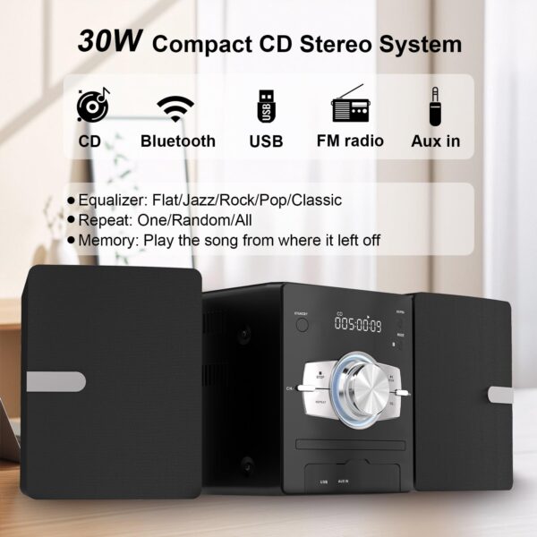 - High-quality sound with maximum output of 30W:15W+15W, high-performance silk tweeter for high frequencies and precise imaging, balanced braided carbon fiber woofer for powerful and transient bass. Simple and elegant compact design, simple and easy operation to enjoy music from CD and smartphone. You can choose your favorite sound quality, pop/jazz/rock/classic/flat, if you like more bass, choose “Bass” mode, if you like soft sound, choose “Jazz” mode.