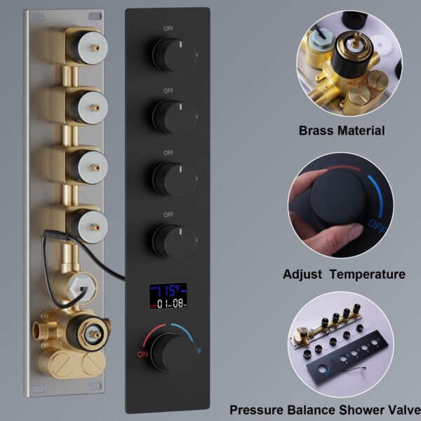 Details: 4 FUNCTION SHOWER MODE: Temperature shower system includes waterfall shower, rain shower, handheld shower and 6 body spray jets. Corresponding buttons control the corresponding spout functions, and you can choose to use each function individually or use all shower functions at the same time. High-quality Material: Full Body shower system with body jets is made of high-quality solid brass, shower jet system set feels sturdy and well-constructed, showcasing the excellent craftsmanship and attention to detail. With its striking design, luxurious rain and waterfall shower head, handheld wand and 6 body jets, reliable brass shower valve, and easy installation process, our rainfall shower systems offers an unparalleled showering experience.