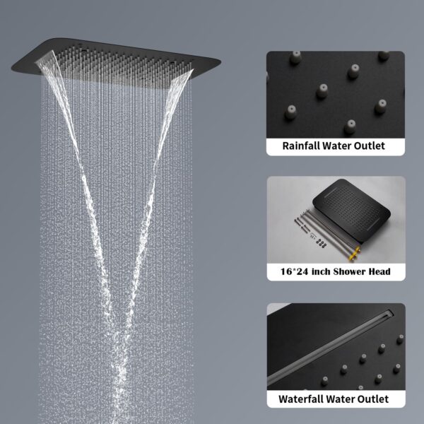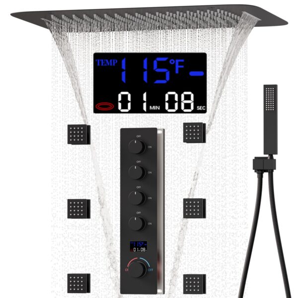 HONGTONGSOWER Shower Faucet Set Matte Black Temperature Shower System with Body Jet, Digital Display Diverter Shower Faucet with 16 X24 Inch Ceiling Rain and Waterfall Showerhead, Can Use At Once