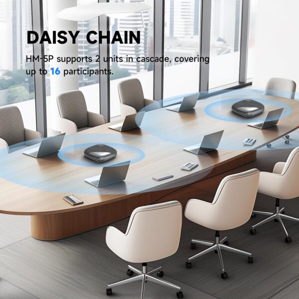 • 360° Voice Pick-up with 8 Mics: HM-5P features a high-performance audio DSP that enables audio processing functions like AGC, ANS, AEC, and de-reverberation, ensuring ultra-clear sound capture. 8 microphones are arranged in a circular pattern to ensure that all voices in the room are captured, leaving no important information behind. With a maximum pickup range of 20 ft, it’s ideal for conference rooms accommodating up to 12 people
