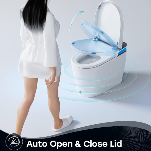 - Auto Open/Close Lid: Like a caring concierge, the smart toilet senses your movements. When you approach, it enthusiastically opens the lid for you and gently closes it when you leave, enjoying an elegant and comfortable hands-free experience.