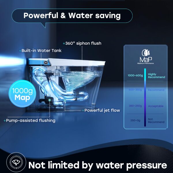 - MAP 1000g Powerful Flushing: Smart toilet with bidet built in Powerful Pump with a great Maximum Performance Flush score of 1000 grams. Dual Flushing – 0.9GPF Half Flush and 1.32GPF Full flush, It provides a powerful flush while conserving water.