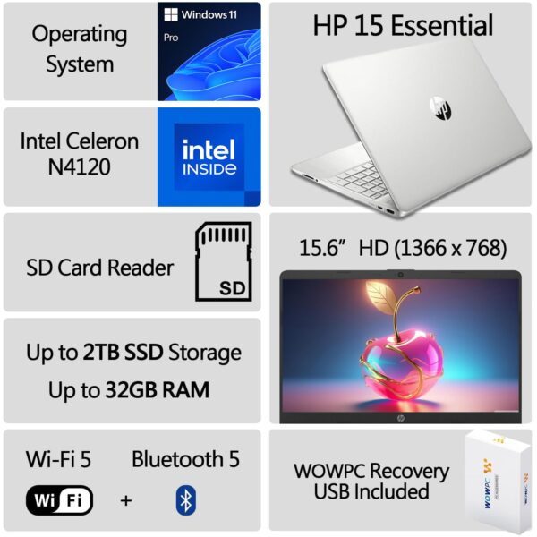 Details: Accessory: WOWPC Recovery USB Processor: Intel Celeron N4120 (Up to 2.6 GHz, 4 cores, 4 threads) Graphics: Intel UHD Graphics Operating system: Windows 11 Pro 64-bit Memory: Up to 32GB DDR4 RAM Hard Drive: Up to 2TB PCIe NVMe M.2 SSD Display: 15.6″ diagonal, HD (1366 x 768), micro-edge, anti-glare, 220 nits, 45% NTSC Connectivity: WiFi, Bluetooth 5 Ports: 1 x USB Type-C 5Gbps signaling rate (supports data transfer only and does not support charging or external monitors) 2 x USB Type-A 5Gbps signaling rate 1 x Multi-format SD media card reader 1 x HDMI 1.4b 1 x Headphone / microphone combo jack 1 x Power connector Audio: Dual speakers Keyboard: Full Size Keyboard, with Numeric Keypad, US English Built-in HD Webcam: HP True Vision 720p HD Camera with Integrated Dual Array Digital Microphones Color: Silver Dimensions L x W x H (inches): 14.11 x 9.5 x 0.7 Weight: Starting at 3 lbs