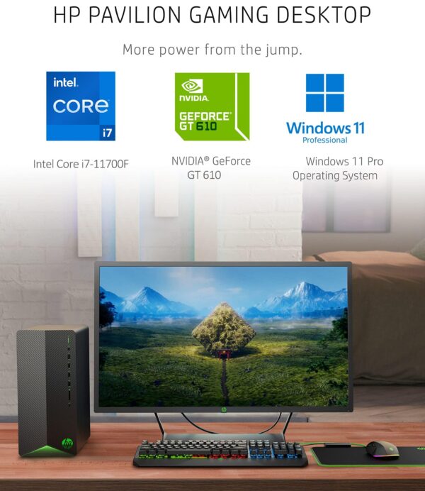 - 【11th Gen Intel Core i7-11700F Processor】 2.5 GHz base frequency, up to 4.9 GHz with Intel Turbo Boost Technology, 16 MB L3 cache, 8 cores. Brings the perfect combination of features to make you unstoppable. Get things done fast with high performance, instant responsiveness and best-in-class connectivity. Design, edit, create, and fuel your creativity with the Pavilion Desktop from HP, which runs your software smoothly and keeps things cool with brushed thermal vents and increased airflow.