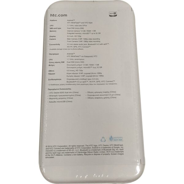PRODUCT : HTC DESIRE 620G FACTORY UNLOCKED ANDROID 3G SMARTPHONE. MODEL : HTC DESIRE 620G. PART NO : 620G. IN THE BOX 1 X HTC Desire 620G Smartphone. STORAGE : 8GB ROM | 1GB RAM. FREQUENCIES : COMPATIBLE TO USE WITH NETWORK SIM CARDS THAT WORKS ON.