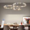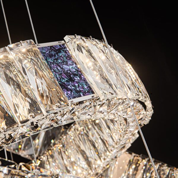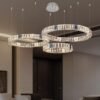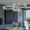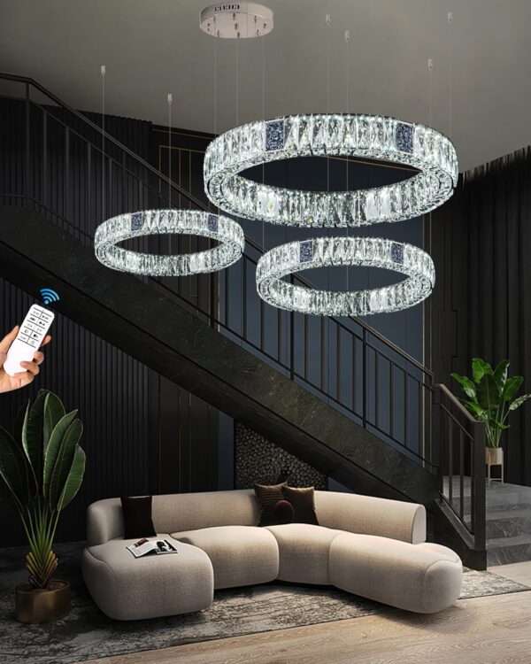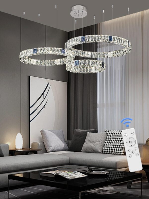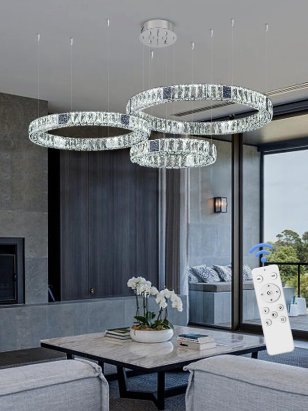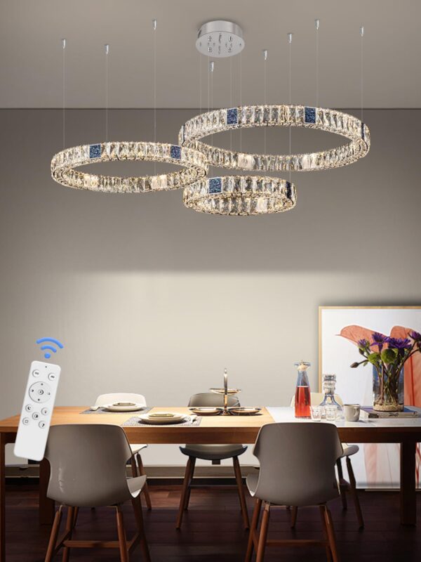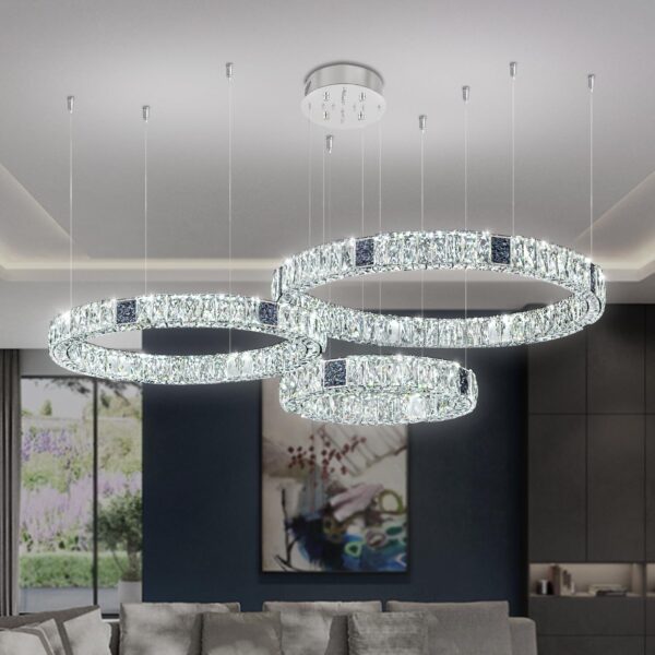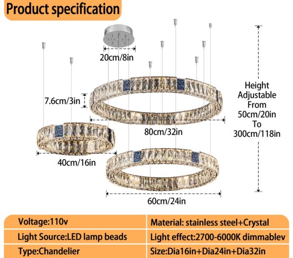 - Crystal Ring Chandelier Size: 3 rings (D16″+D24″+D32″); Cable length Max 118″/300cm (Adjustable). The LED pendant lighting is perfect for installing over the dining room table, kitchen island, and restaurants, and also suits the living room, bedroom, hallway, hotel, staircase, foyer, office…