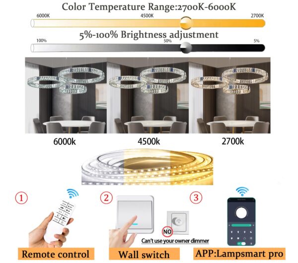 - BULB DETAILS : Including LED bulbs 100W, and remote control dimmable 3000-6000K color temperature, 5%-100% brightness adjustment, the chandeliers have their own dimmers, which can adjust different light colors according to mood