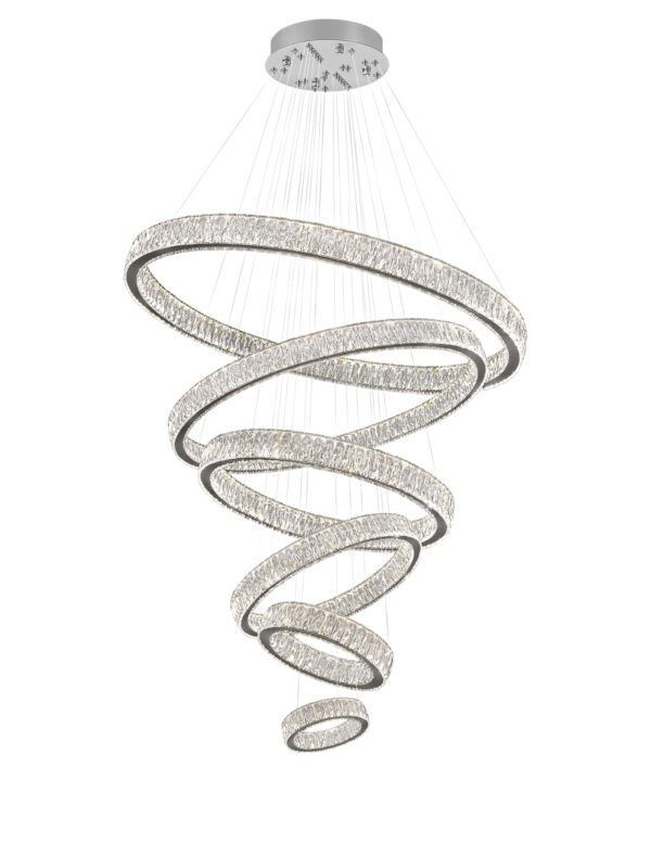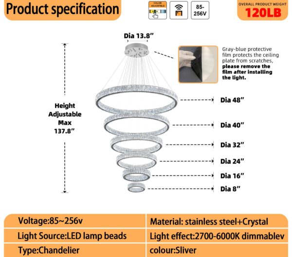- Crystal Ring Chandelier Size: Instead of traditional ordinary crystals, Use 3*7.6cm K9 big crystals. 5 rings (D8″+D15.7″+D23.6″+D31.5″+D39.4″+D47.5″); Cable length Max 138″/350cm (Adjustable). The LED pendant lighting is perfect for installing over the dining room table, kitchen island, and restaurants, and also suits the living room, bedroom, hallway, hotel, staircase, foyer, office…