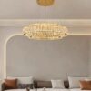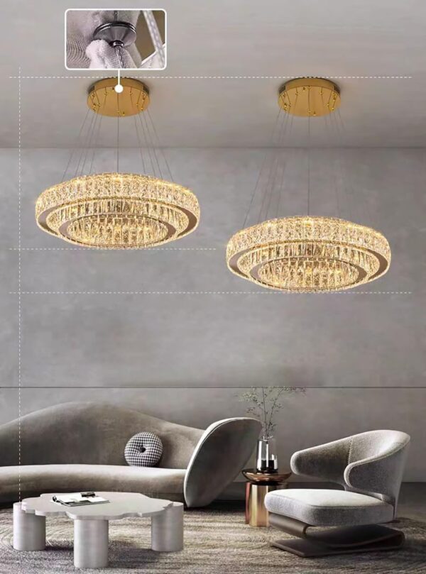 - ✨【Crystal Ring Chandelier Size】:Cable length max118″/300cm(adjustable).Gold Stainless Steel L32” X W32” X H118” .Power: 130W,Light source: LED strip, environmental protection and energy saving, no flicker, eye protection.