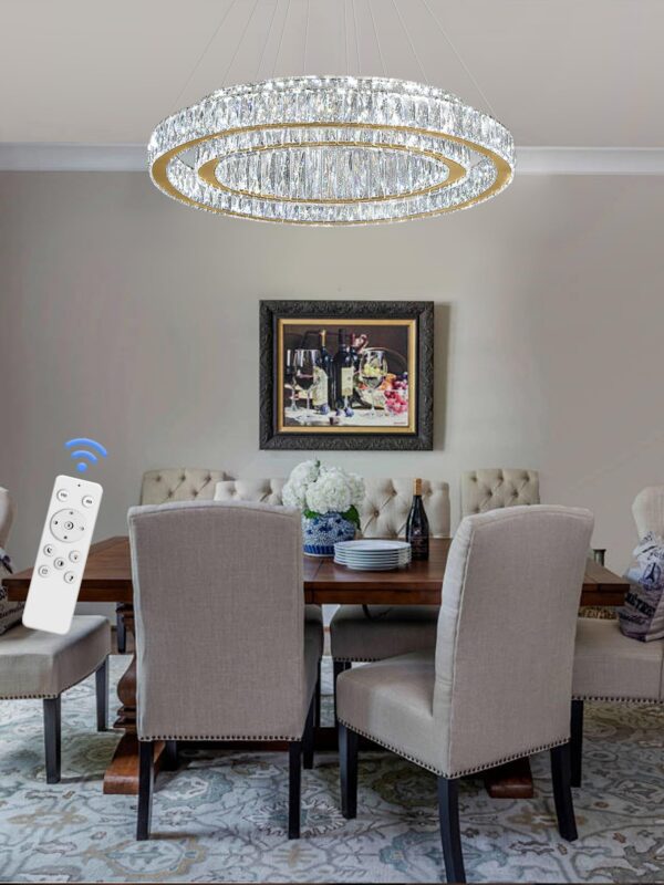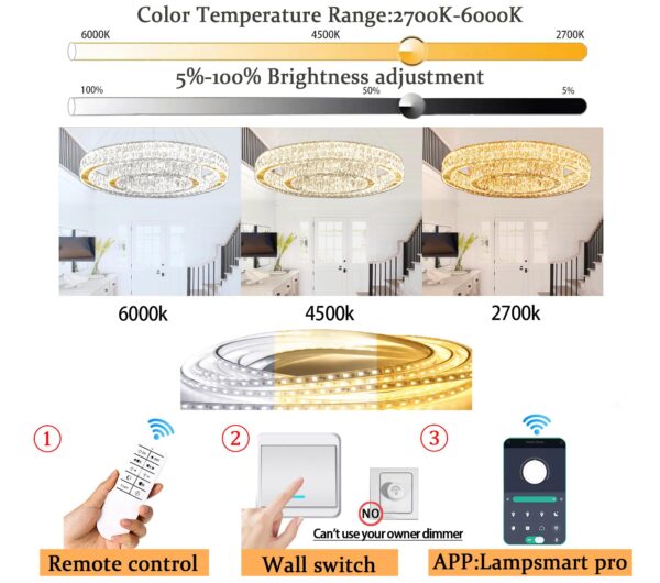 - ✨【Dimmable LED Crystal Ring Chandelier】: Include Built-in 120 Watts High-quality LED ceiling lightstrip, Uo to 10800 lumins provides ample liaht.With 3-color temperature changing. Please note that chandeliers have own dimmers (include),only can be used with reqular wall switches, and isnot compatible with home dimmer switches, You also can use remote(included) andAPP(Lampsmart pro) to switch color temperature as you like from 2700k-6000k and 5%-100%brightness adjustment.DC.Voltage=85-256V.