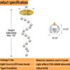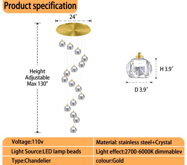 - ✨【Modern led crystal ball chandelier size】 Gold Stainless Steel L24″ X W24″ X H130” . Pendant cord is adjustable. The whole lamp is 130″ tallest. The shortest height is 20″ . wide and the voltage can be anywhere AC85-256V.