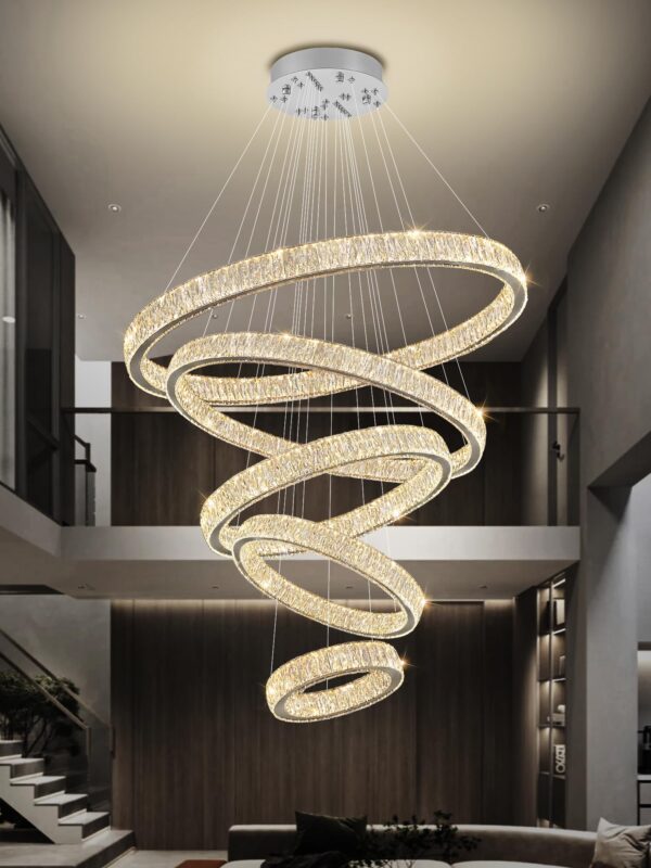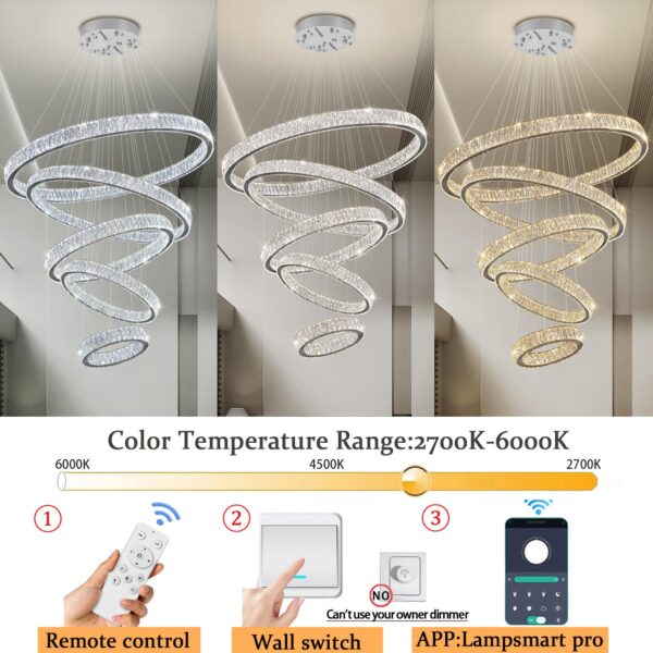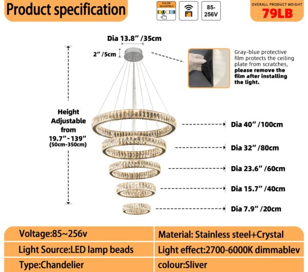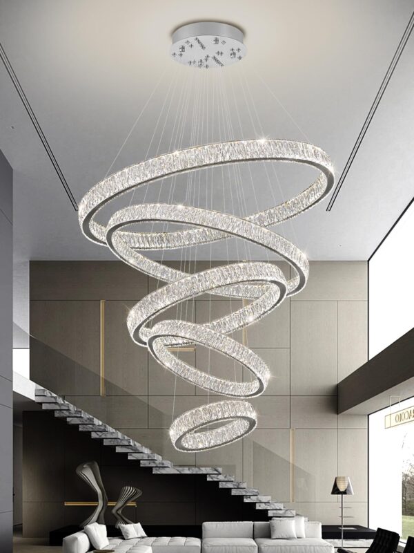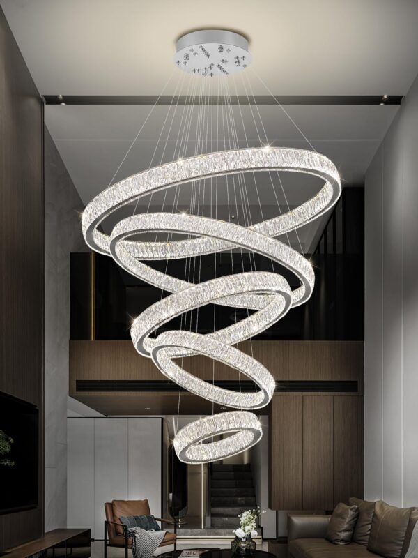 - Crystal Ring Chandelier Size: Instead of traditional ordinary crystals, Use 3*7.6cm K9 big crystals. 5 rings (D8″”+D15.7″”+D23.6″”+D31.5″”+D39.4″”); Cable length Max 138″”/350cm (Adjustable). The LED pendant lighting is perfect for installing over the dining room table, kitchen island, and restaurants, and also suits the living room, bedroom, hallway, hotel, staircase, foyer, office…