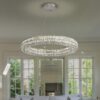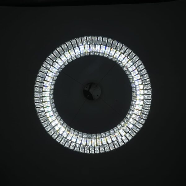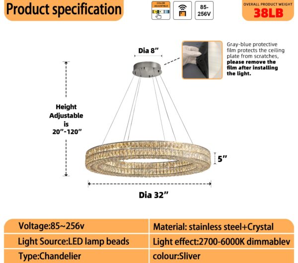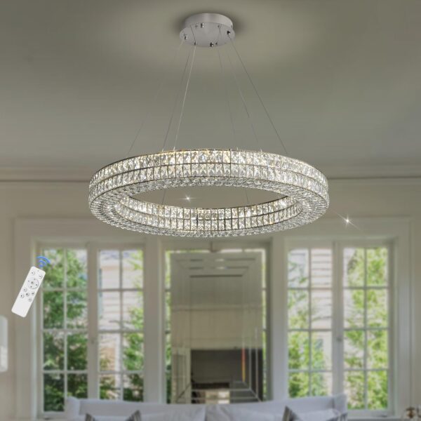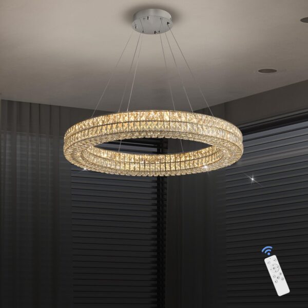 - ✨【Dimmable LED Crystal Ring Chandelier】: Include Built-in 67 Watts High-quality LED ceiling lightstrip, Uo to 6030lumins provides ample liaht.With 3-color temperature changing. Please notethat chandeliers have own dimmers (include),only can be used with reqular wall switches, and isnot compatible with home dimmer switches, You also can use remote(included) andAPP(Lampsmart pro) to switch color temperature as you like from 2700k-6000k and 5%-100%brightness adjustment.DC.Voltage=85-256V.