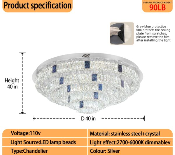 - ✨【Dimmable Round Ceiling Light Size】:5 Tiers (D7.8″+D11.8″+D24″+D32″+D40″). Lamp body Length 40″ x Width 40″ x Height 13″. AC85-256V suitable for anywhere, Pendant stick is not adjustable . Please ensure dimensions of this crystal chandeliers is fit for your prepared space or not.