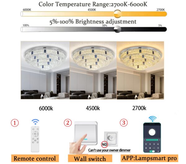 - ✨【Dimmable LED Crystal Ring Chandelier】: 300W.27000Lumens.Including built-in LED light source,and remote control dimmable 3000-6000K color temperature, 5%-100% brightness adjustment,the chandeliers have their own dimmers, which can adjust different light colors according to mood.The AC85-256V voltage can be anywhere .
