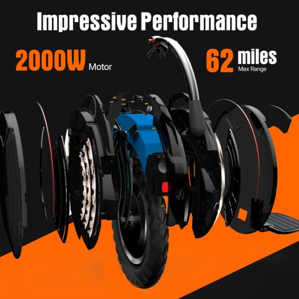 • With a robust 2000W motor, it reaches a maximum speed of 25 mph and provides a range exceeding 62 miles