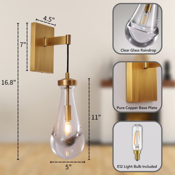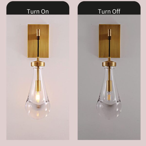 - 【Thickened Material】All the external metal parts of this modern sconces wall lighting are made of copper, which makes this wall light fixtures more textured. The hand-blown glass shade makes each sconces wall lighting a unique presence. The bottom of the raindrop glass shade is thicker, making the light softer.