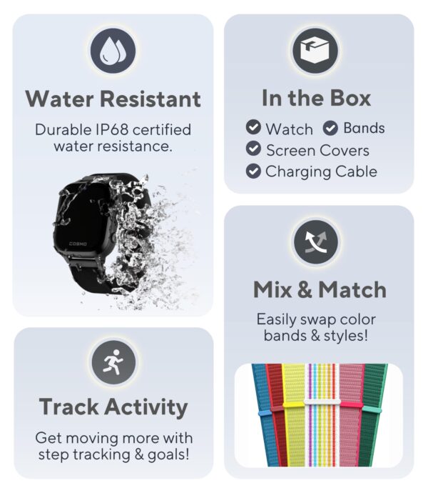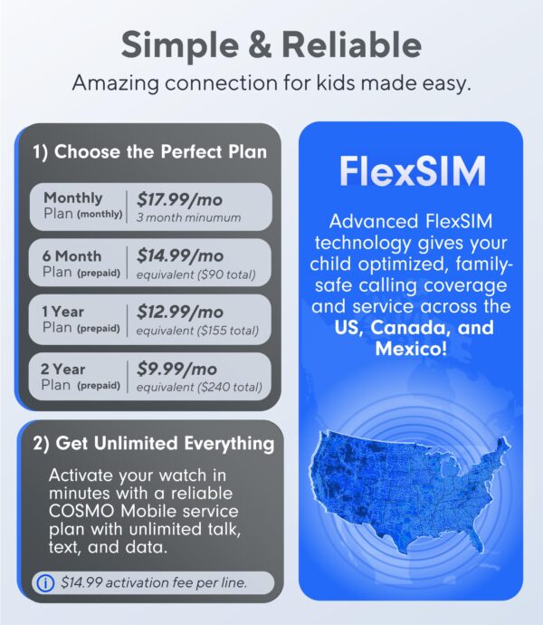 - UNLIMITED TALK, TEXT, AND DATA –– Stay connected anytime, anywhere with COSMO Mobile Family-Safe service. Easily activate your watch’s pre-installed SIM card out of the box and choose from flexible and affordable cellular service plan options – starting at just $9.99/month equivalent with prepaid plans. (NOTE: JrTrack is not compatible with other carriers)