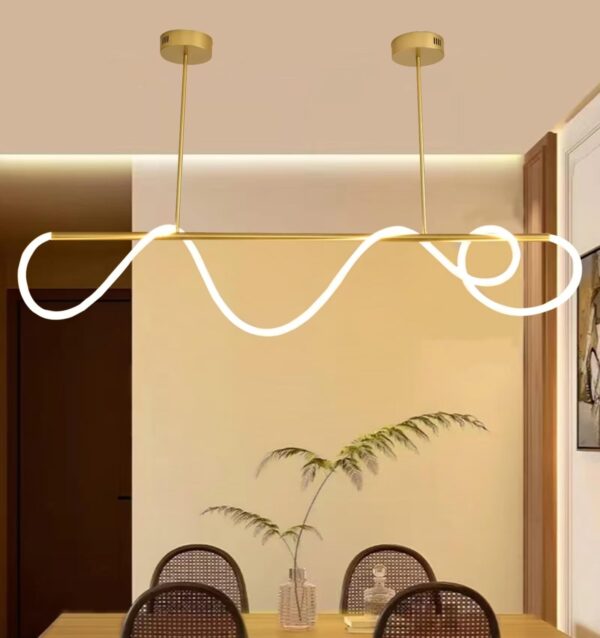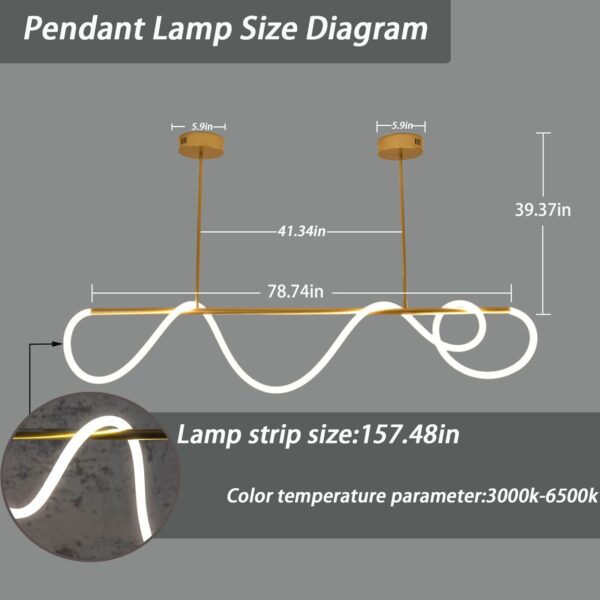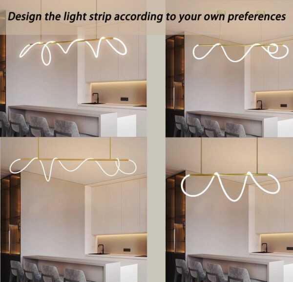 - QUALITY MATERIALS:LED pendant light is made of high quality aluminum and silicone tube,pendant lights is coated with very textured gold coating.The chandelier and light strip are made of high temperature resistant material.LED light strip with 41W low power consumption and silicone embedded 360° luminous without dead angle luminous light strip to realize energy saving effect.The strip has strong light transmission and heat dissipation,the strip can be used for a long time without replacement.
