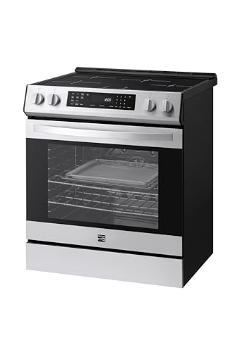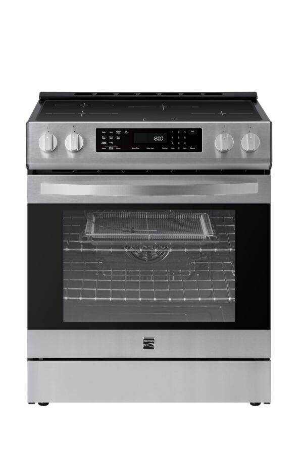 Details: The Kenmore 5.6 cu. ft. Front-Control Induction Range combines innovative technology with modern design for a seamless cooking experience. Its front control panel offers easy access to settings without reaching over hot cookware. Four induction elements, including Electric Turbo Boil, deliver precise, efficient heat. The Air Fry setting with the included basket creates crispy, oil-free dishes, while True Convection ensures even baking and roasting. The Self-Clean oven offers customizable 2, 3, or 4-hour cycles to tackle tough messes, and the hidden bake element provides a smooth interior for effortless cleaning. Convection Conversion adjusts temperatures automatically for perfect results, and the versatile broil function enhances flavor with a delicious crust. Precision Set Controls provide 25 advanced settings, including Delay Start and Keep Warm. The large window and halogen light make it easy to monitor your cooking progress without opening the oven door. A temperature probe ensures precise cooking, while ultra-durable chrome racks hold even the heaviest dishes. A convenient storage drawer keeps pans and trays neatly organized and within easy reach, adding the perfect finishing touch to this versatile and feature-packed appliance.