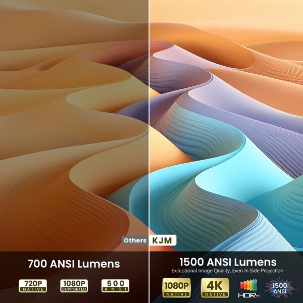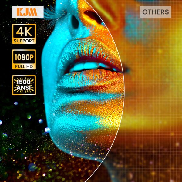 • 【1500 ANSI | Native 1080P | Support 4K | HDR10】The KJM K3 projector leads the way in visual experience, boasting a true 1500 ANSI lumens and 4K decoding for bright and vibrant visuals with impeccable detail. Combined with the latest HDR10 and native 1920*1080p resolution, it delivers astonishing clarity, contrast, and color accuracy. K3 projector is the ultimate cost-effective choice for home and outdoor projection, elevating your viewing experience to unprecedented height.