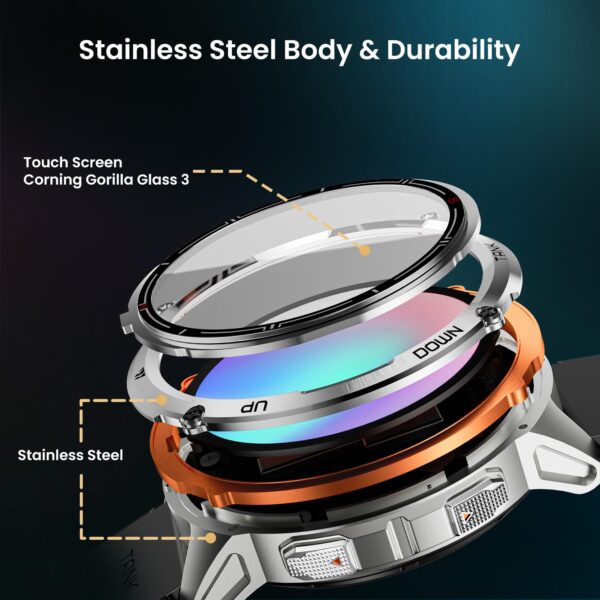 • ➤【Full Stainless Steel Unibody & Gorilla Glass】KOSPET T3 Ultra 2 Men’s Smartwatch with a unibody stainless steel case, boasts a 1.43″ 3rd generation Corning Gorilla 9H double-layer glass display. The overall sports charm and casual business aesthetics make it highly resistant to scratches, drops, and polishing. It remains unfazed by any kind of wear and tear, falls, or collisions in daily life.
