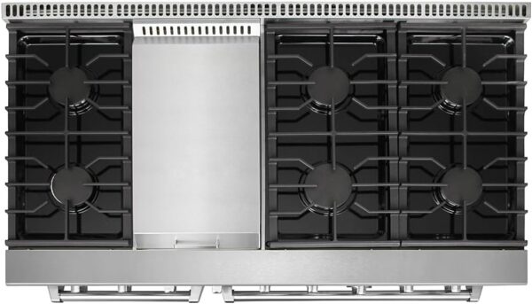 - The 48 inch freestanding professional gas or propane gas range features the six high-performance gas burners & 1 Griddle Cooktop, the oven provides precise heat control, ensuring your dishes are cooked to perfection every time. The gas range’s sleek and modern design enhances the aesthetics of your kitchen, adding a touch of elegance to your cooking space.
