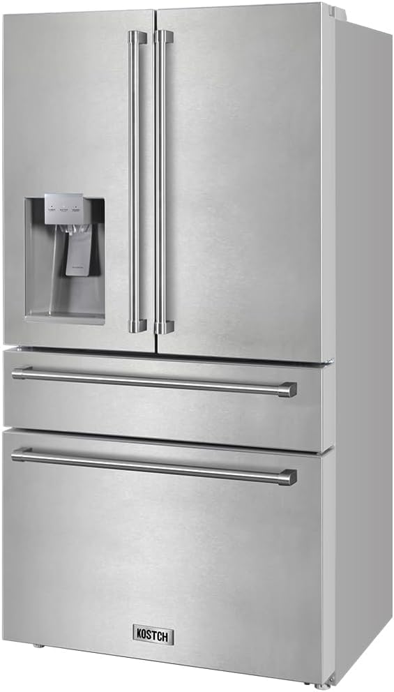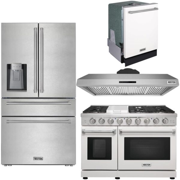 KOSTCH 4 Set – 48″ Natural or Liquid Propane Gas Range, 48″ Wall-Mounted Range Hoods, 36″ 21.6 cu. ft. French Door Refrigerator/Fridge & 24″ Top Control Built-In Dishwasher (White)