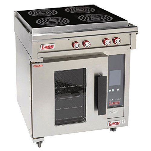 Details: Lang’s Induction Range, electric, floor model, 30″W, (4) 8″ glass induction hobs, convection oven base with (3) rack positions and (1) rack, 150°-450°F solid state oven thermostat with 1-hour timer, 2″ vented stainless steel stub back, 430 stainless steel exterior, 4″ casters, 18.2 kW, cULus, NSF 2 yr. parts & labor warranty, lifetime oven door warranty, continental USA, Hawaii & Canada, standard