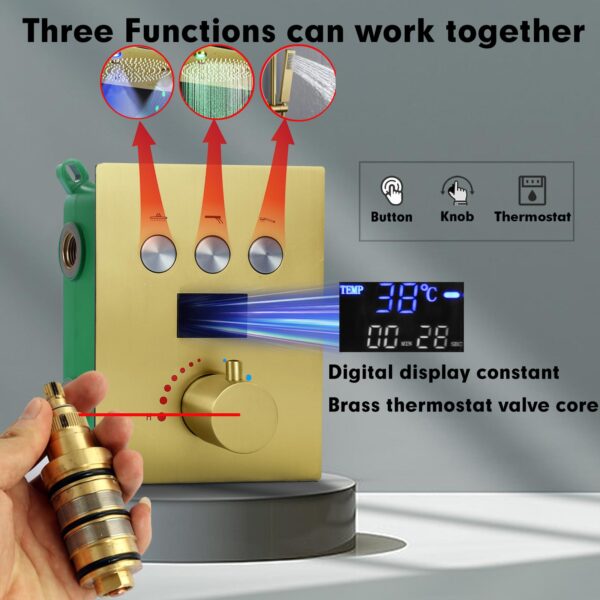 - DIGITAL DISPLAY THERMOSTATIC SHOWER VALVE(Hydroelectric Power Doesn’t Need Batteries)In a short time, it will automatically balance the cold and hot water pressure to maintain water temperature stable, no need to adjust temperature each time. Each function is controlled by a smart button, so all functions can work simultaneously or individually, No flow volume control.