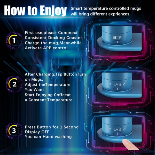 - 【Manual and App-Controlled】LEGARDLILIU Rechargeable Temperature Control Smart Mug has an on/off time preset function on APP. This self warming coffee mug has two methods of temperature control for you to choose from.You can adjust the temperature directly through the touch button on the smart coffee mug and the LEGARDLILIU APP on your phone.The included sliding lid also brings you more convenience. You can drink hot coffee anytime, anywhere.
