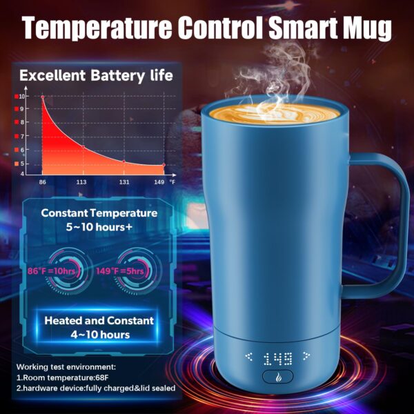 - 【Patented Heating Tech】With a patented heating technology, it can heat without coaster. When no water, the mug will automatically stop heating for safety. This Warmer smart coffee thermos mug works with 4000Ah high-capacity polymer lithium battery, LEGARDLILIU Rechargeable smart mug can last 5-10 hours, It can keep the drink warm all day long when on the charging coaster, The heating temperature range is 86-149℉. Keep Your Coffee Temperature Constant, keeps your coffee hot for hours.