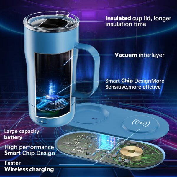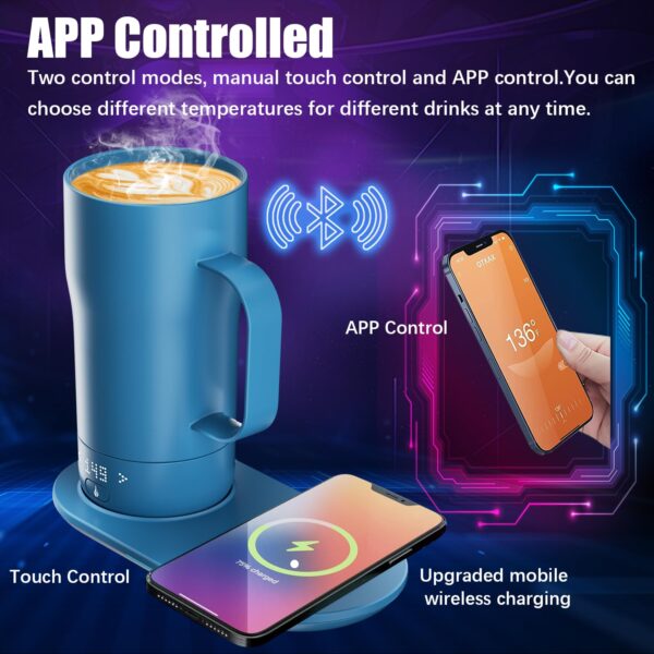 LEGARDLILIU Smart Self Heating Coffee Mug 18 Oz Temperature Control Heated Coffee Mug App Controlled Warmer Mug 5-10 Hour LED Display Keep Coffee Hot All Day Fast Wireless Charger Base Lake Blue