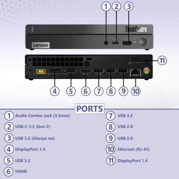 - Connectivity: Intel Wi-Fi 6 AX201, 802.11ax 2×2 + Bluetooth 5.2; Front Ports: 1x USB-C 3.2 Gen 2 (support data transfer and 5V@0.9A charging), 1x USB 3.2 Gen 2 (Always On and 5V@2.1A charging), 1x headphone / microphone combo jack (3.5mm); Rear Ports: 2x USB 2.0, 2x USB 3.2 Gen 2, 1x HDMI 2.1 TMDS, 2x DisplayPort 1.4, 1x Ethernet (RJ-45).