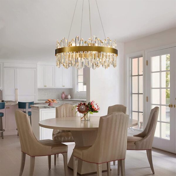 - 【Modern Gold Chandelier】: This Gold Oval Crystal Chandelier Created with K9 crystal and quality metal which is suitable for any decoration styles. Creates warm & soft light atmosphere.Suitable for dining room, living room, kitchen island, bedroom, hallway, office, entry, foyer, staircase, etc