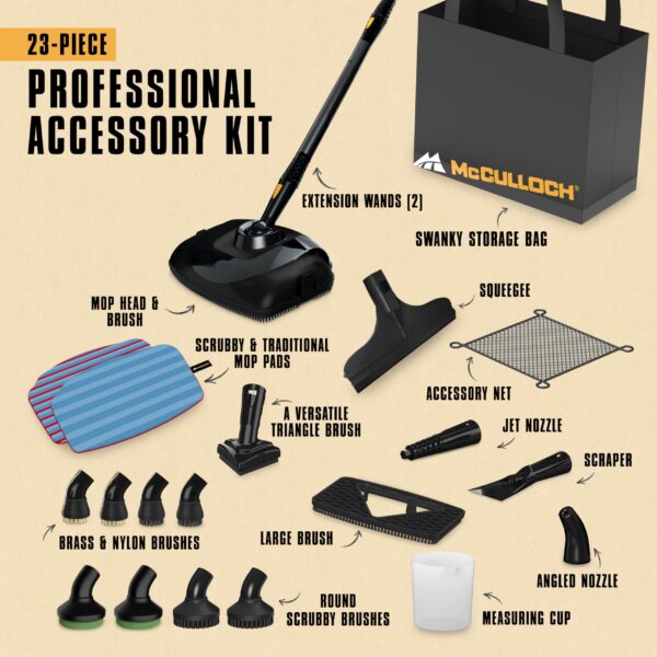 McCulloch MC1385 Deluxe Canister Steam Cleaner, 2-Hour Runtime, Chemical-Free, 23 Accessories: Mop Head, Brushes & More – Built for Home, Tile, Carpet, Furniture, & Personal Car Detailing