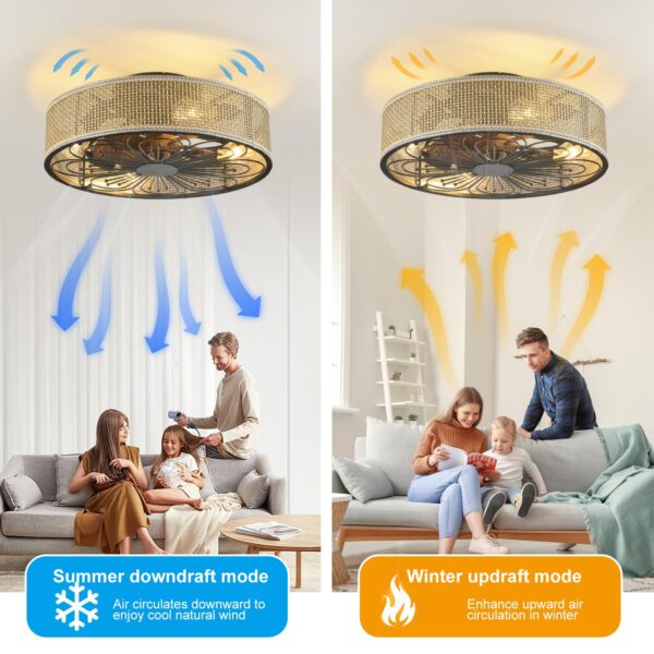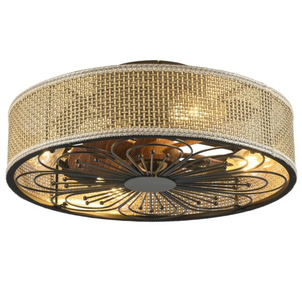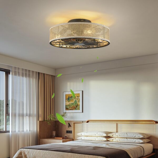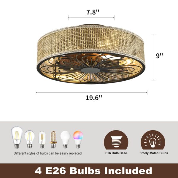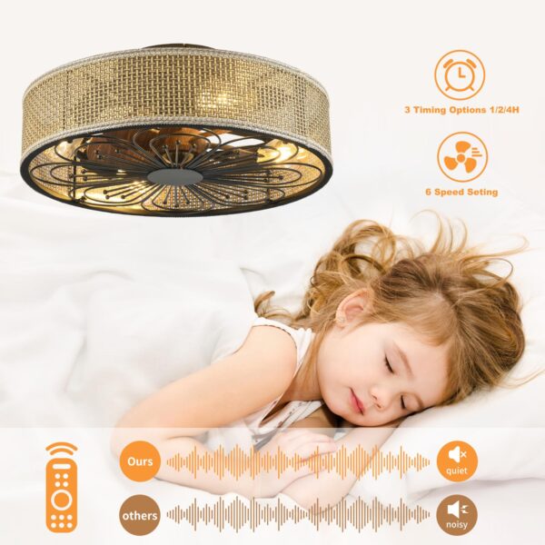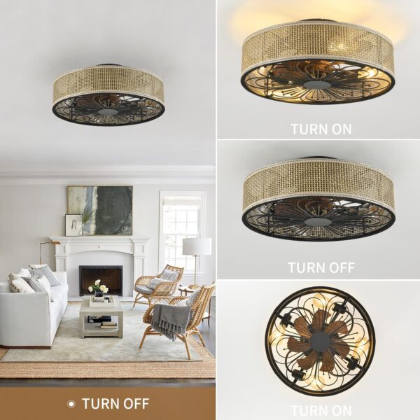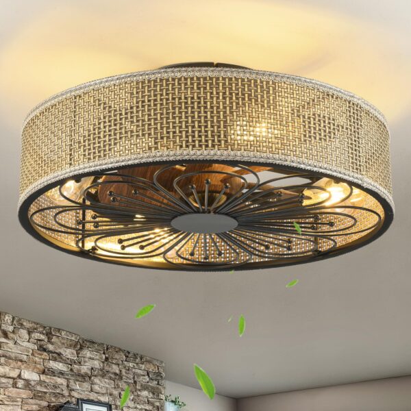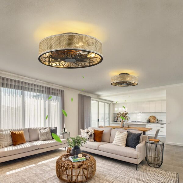 MeZeYo Modern Boho Rattan Flush Mount Ceiling Fans with Lights and Remote Control Low Profile Bladeless Ceiling Fan Timer and 6-Speed Reversible Motor for Bedroom, Kitchen, Dining Room Include Bulbs