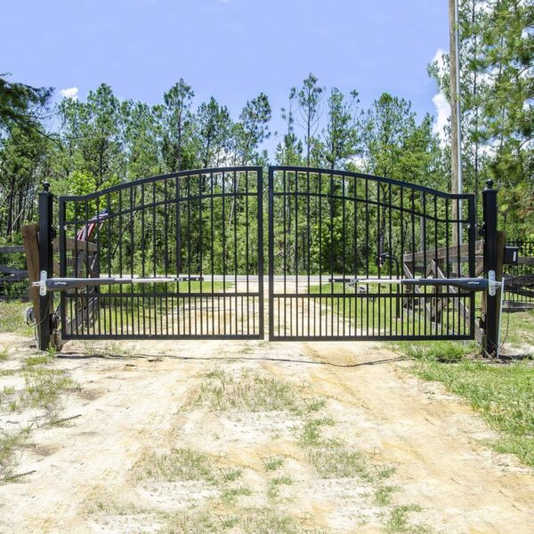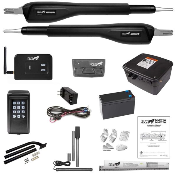 Details: Take control of your driveway or entrance with the Mighty Mule MM572W-EST-A Automatic Dual Gate Opener Kit, a complete DIY solution for added security and convenience. This heavy-duty system tackles even long gates, up to 18 feet or 850lbs per leaf, making it great for driveways and entrances. Convenience is at your fingertips with smartphone control via the included MMS100 Smart Bridge and your smartphone app. Open, close, and monitor your gate from anywhere, ensuring peace of mind whether you’re at home or away. The MM572W-EST-A kit includes everything you need for a smooth installation: the heavy-duty dual opener, MMK200 Wireless Keypad for easy access control, FM100 Keypad Mounting Post for secure placement, MMS100 Smart Bridge for smartphone control, FM130 Wireless Driveway Alarm for enhanced security, two remote controls, and all the necessary hardware and brackets. Plus, the system is solar-capable (FM123 panel sold separately) for an eco-friendly touch. Safety is a priority with UL325 certification and audible obstruction warnings. An 18-month warranty provides additional peace of mind. The Mighty Mule MM572W-EST-A is perfect for homeowners seeking added security, farms and ranches controlling land access, and businesses managing deliveries and securing work areas.