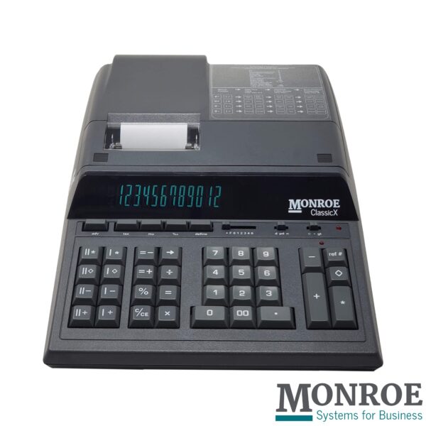 - WHAT’S IN THE BOX: One Monroe ClassicX printing calculator, power cord, instruction manual, one calculator cover, one Monroe M33X ribbon cartridge and one Monroe 20lb. bond starter paper roll