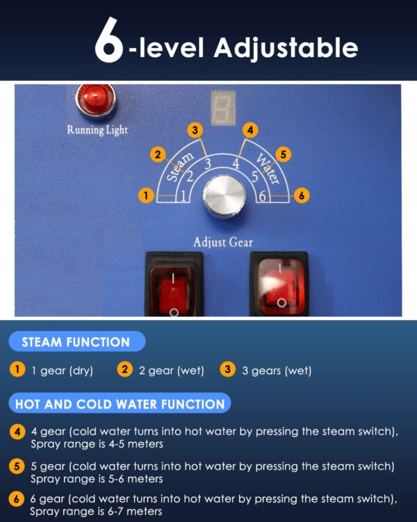 - [About Steam Function] After turning on the machine, first press the switch on spray gun to make running light on, and select 4 level to spray cold water. Then press spray gun switch again to make running light off, Now the steam switch can be turned on and start to use the 1-3 level Steam Function.