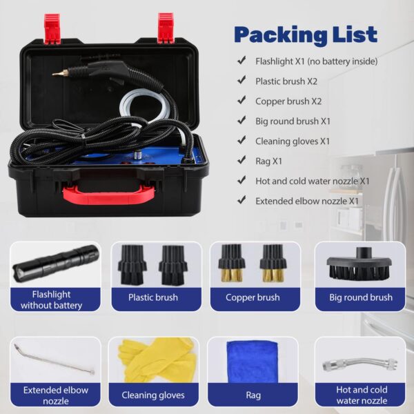 - Steam Cleaner With Attachments – You can get 1 x Cleaning Machine; 1 x Extended Elbow Nozzle; 1 x Hot and Cold Water Nozzle; 1 x Large Round Brush; 2 x Small Plastic Brush; 2 x Small Copper Brush; 1 x Gloves; 1 x Rag; 1 x Plastic Scraper; 1 x Flashlight (no battery inside).