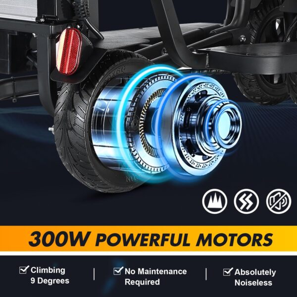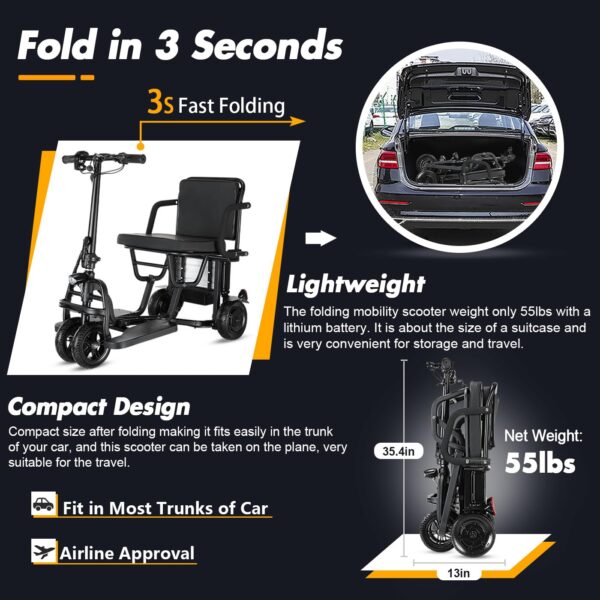 - 👨🦼【Mobility Scooters 】 Electirc mobility scooter with lightweight compact frame design,net weight only 55 lbs. Its unique design allows it to fold quickly, about the size of a suitcase, folding electric scooters is a breeze without disassembling it into several parts and be stored in a car’s trunk. suitable for shopping,on vacation and everyday use, maximum support capacity: 300lbs