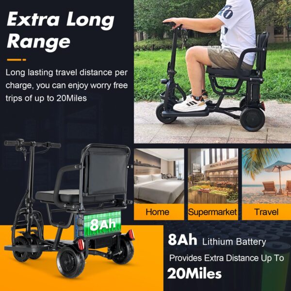 - 👨🦼【Lightweight mobility scooter with 8AH Lithium Battery】Electirc Scooter has high mobility and long endurance, equiped with 8AH lithium battery and support for 20 miles Long distances. Its maximum speed is 9.3 mph